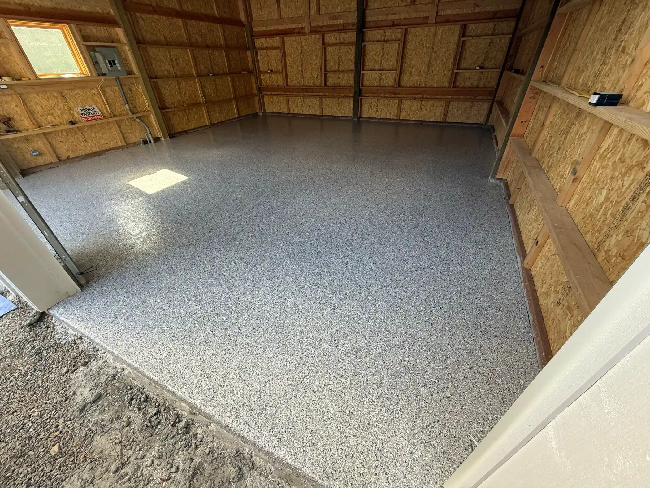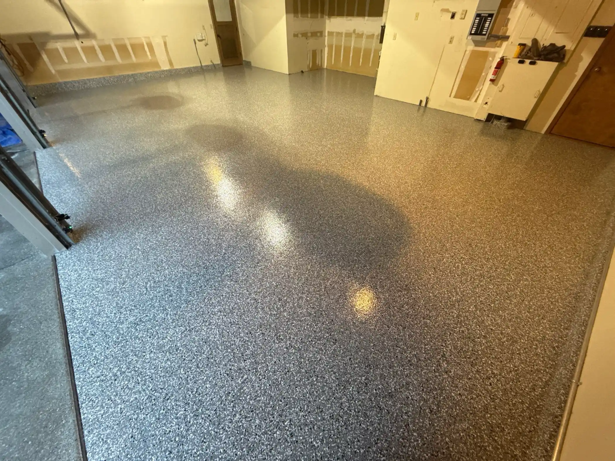 Base coat, decorative chip broadcast, scraping, and polyaspartic top coat — all installed in a single day by our certified Penntek team. You choose from a wide range of designer flake colors and finishes. Your floor is complete and curing the same day we arrive.
